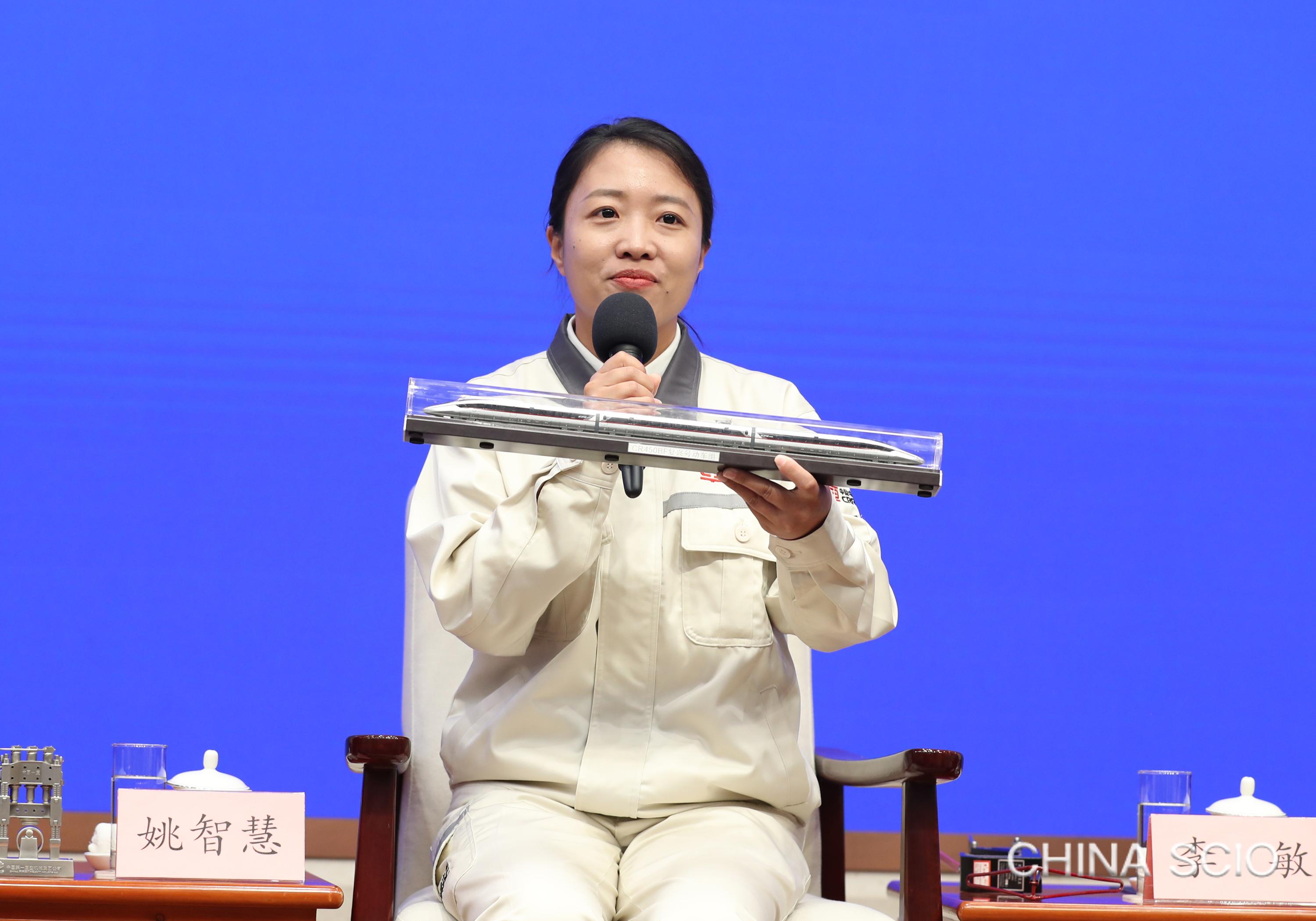 Yao Zhihui, a vehicle electrician at the National Railway Division of CRRC Changchun Railway Vehicles Co. Ltd., attends a group interview in Beijing, June 5, 2025. [Photo by Xu Xiang/China SCIO]