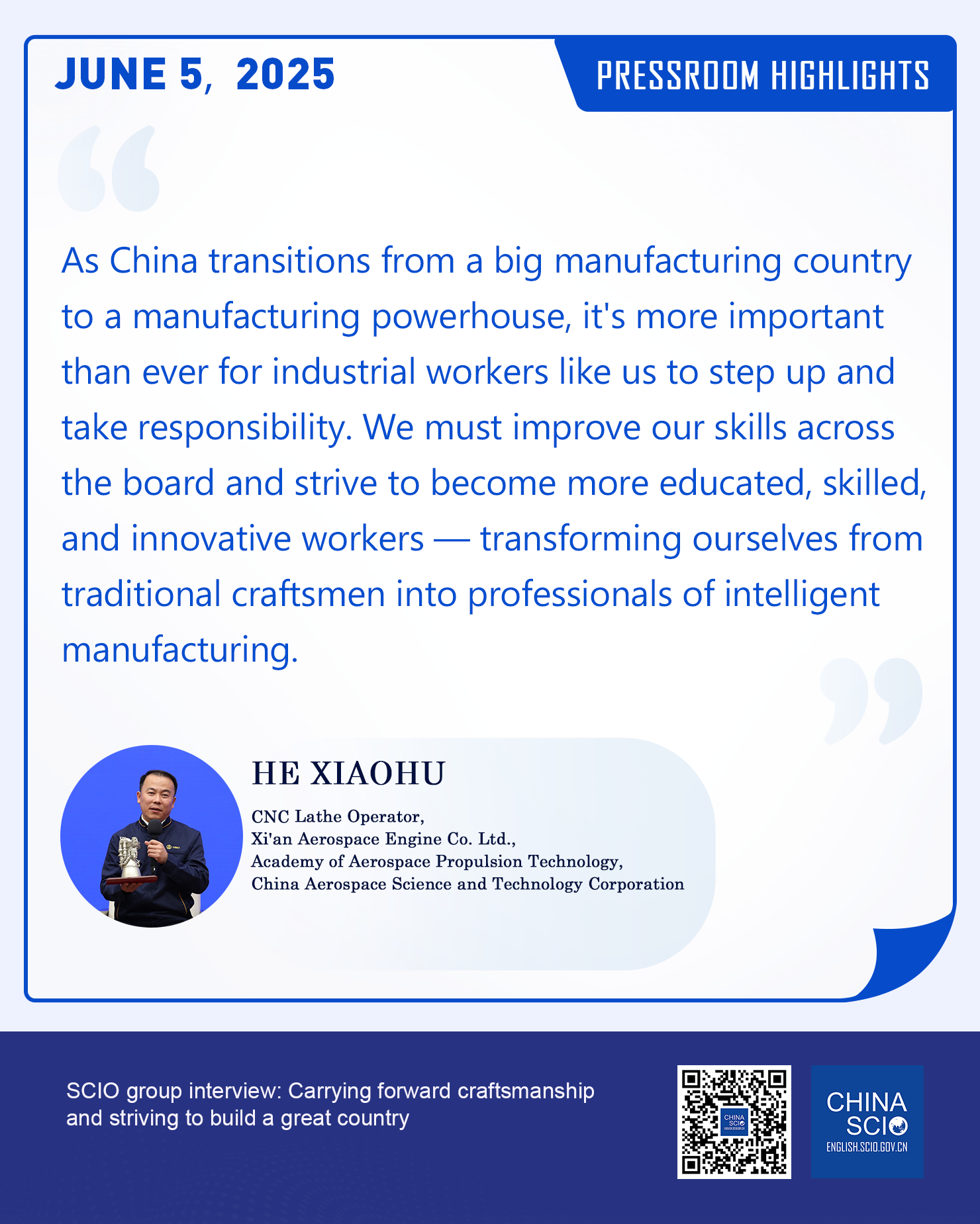 The State Council Information Office held a group interview Thursday in Beijing on carrying forward craftsmanship and striving to build a manufacturing powerhouse. Five worker representatives from China's central state-owned enterprises shared their stories at the event.