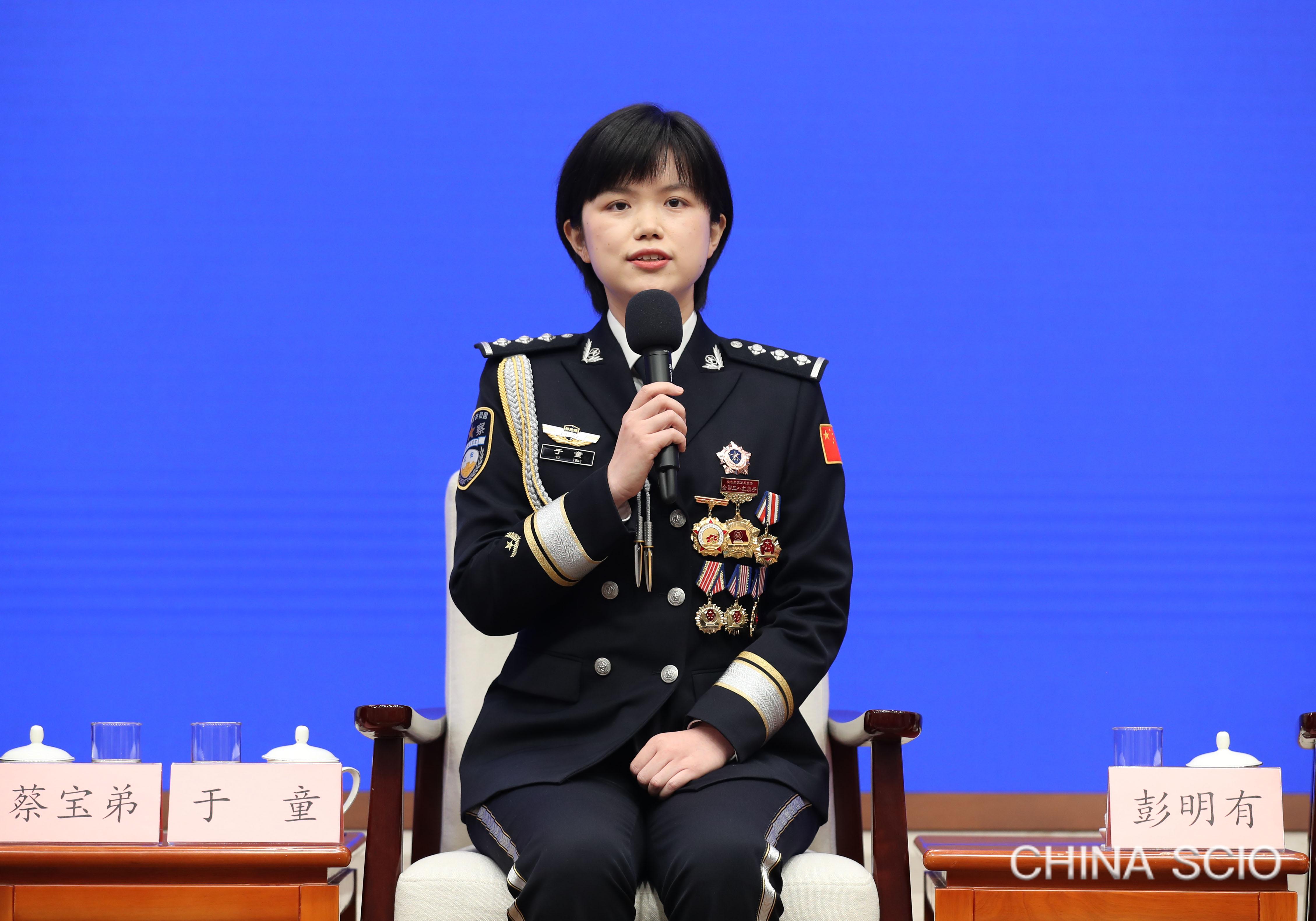 Yu Tong, sergeant at the Baiyun Border Inspection Station of the Guangzhou General Station of Immigration Inspection, attends a group interview in Beijing, June 11, 2025. [Photo by Xu Xiang/China SCIO]