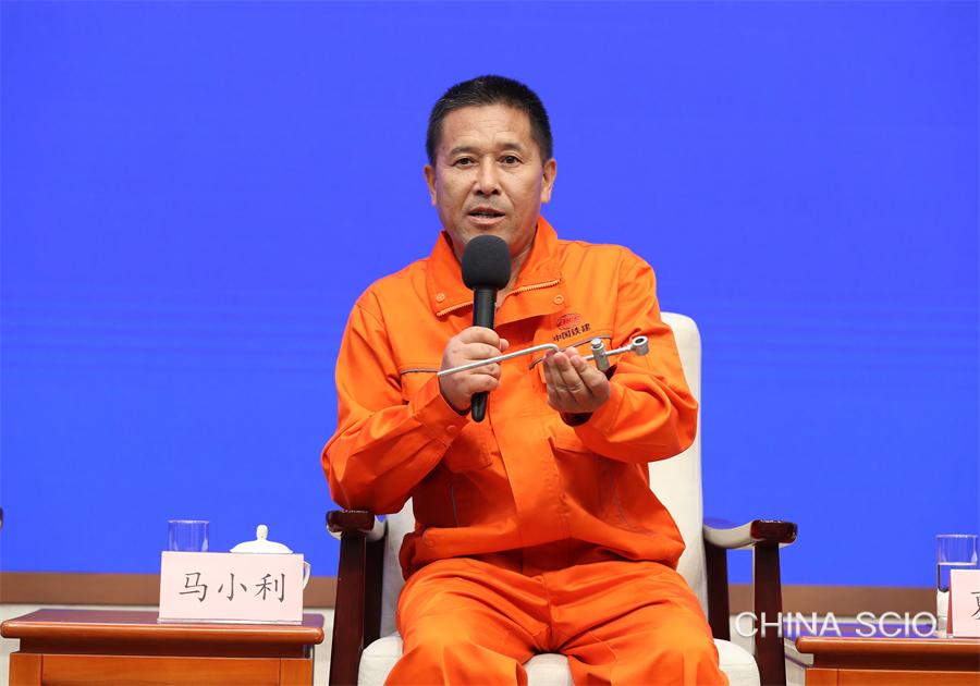 Ma Xiaoli, a staff member of the Pingqing Railway Project of China Railway 21st Bureau Group Co. Ltd., attends a group interview in Beijing, June 19, 2025. [Photo by Xu Xiang/China SCIO]