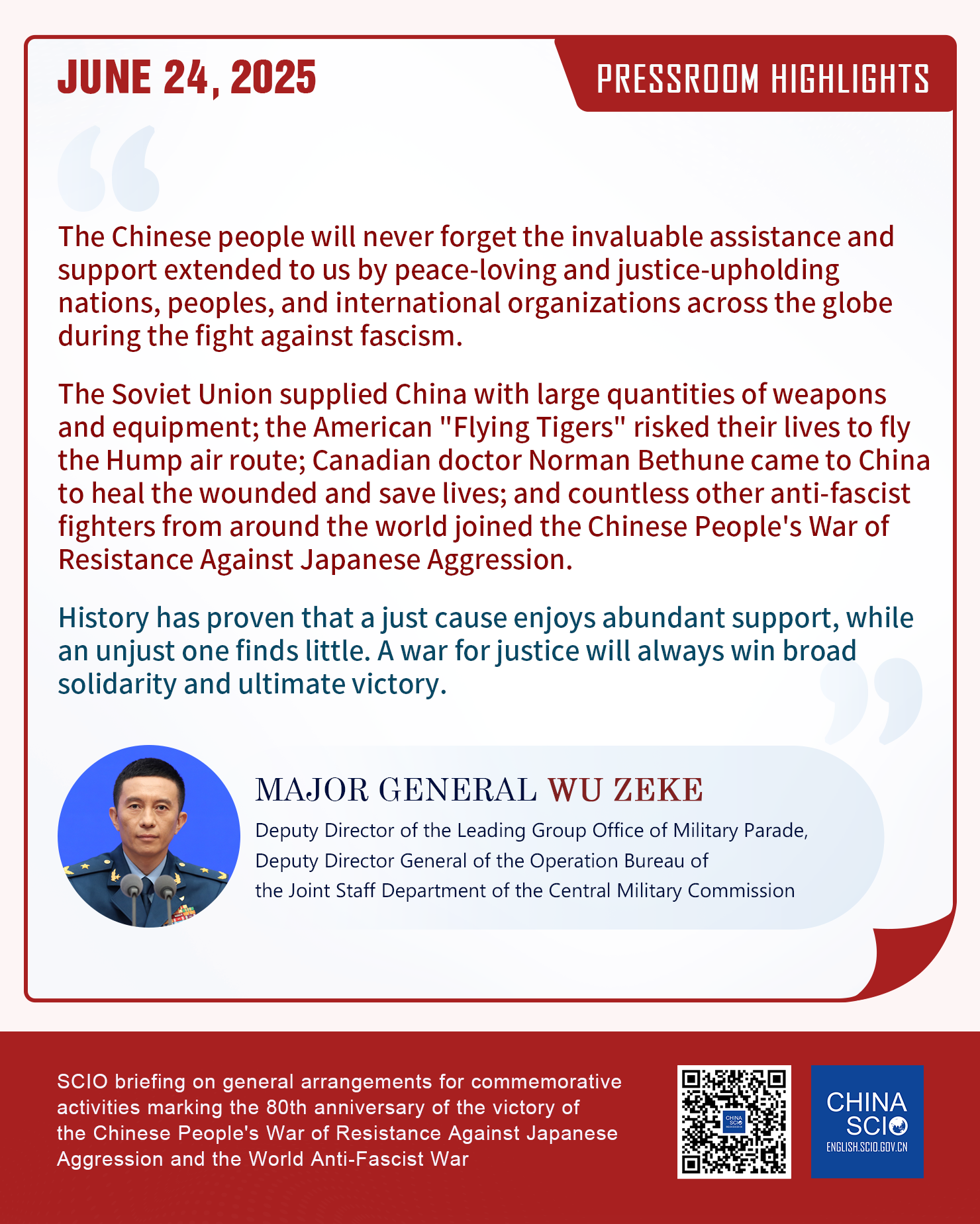 The Chinese people will never forget the invaluable assistance and support extended by peace-loving and justice-upholding nations, peoples, and international organizations across the globe during the fight against fascism, Major General Wu Zeke said during a press conference unveiling the country's plans for marking the 80th anniversary of the victory in the Chinese People's War of Resistance Against Japanese Aggression and the World Anti-Fascist War.