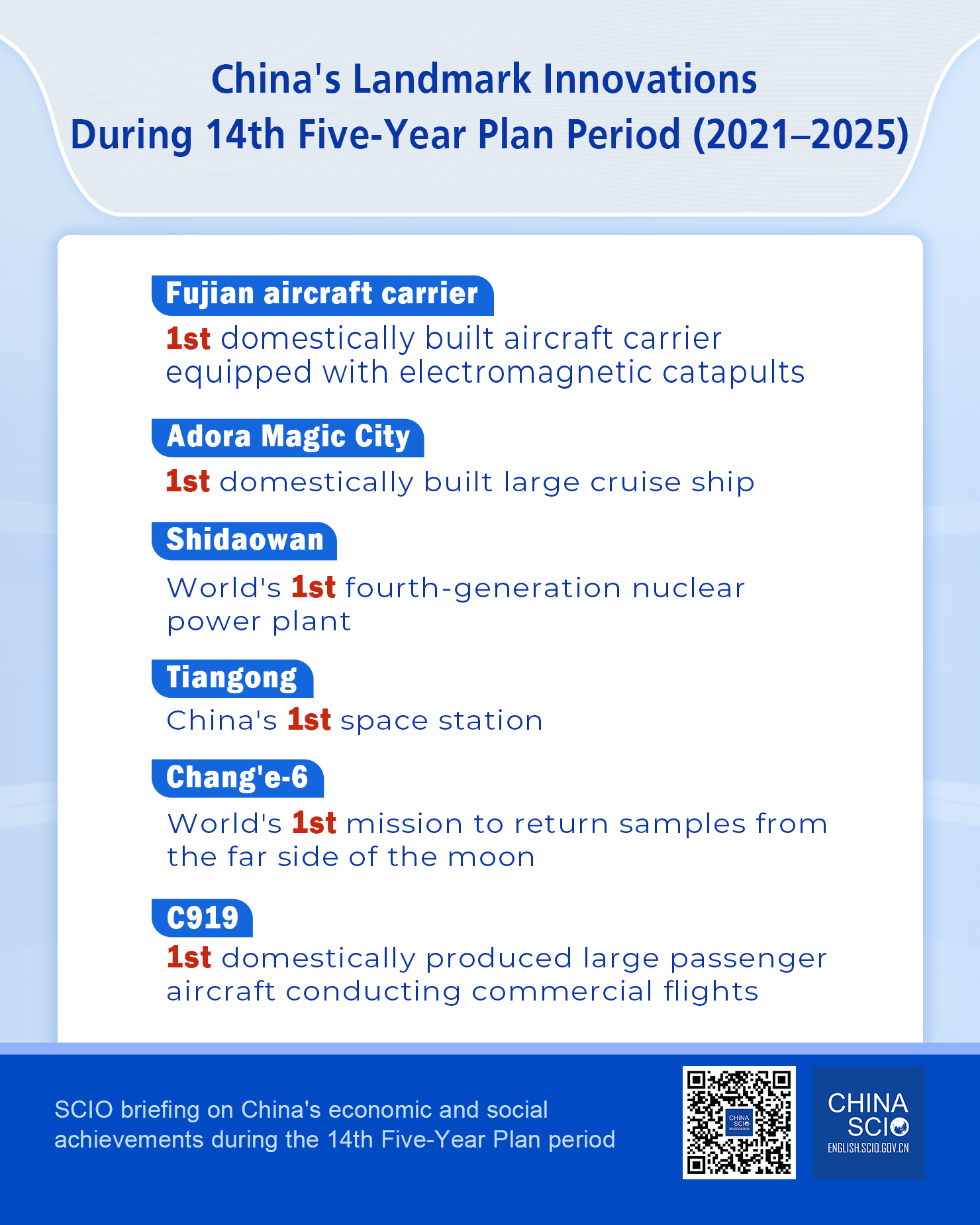 From its first domestically built aircraft carrier with electromagnetic catapults to the world's second space station and a pioneering lunar far-side sample return, China has achieved a series of significant breakthroughs in innovation during the 14th Five-Year Plan period (2021-2025).