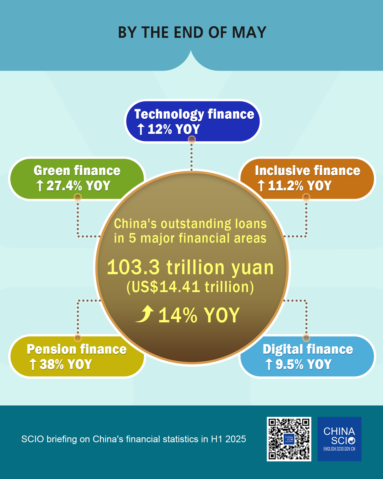 China has stepped up efforts to develop technology, green, inclusive, pension, and digital finance to better support the real economy. During the first five months of 2025, outstanding loans in these five areas reached 103.3 trillion yuan (US$14.41 trillion), up 14% year on year, according to official data released Monday.