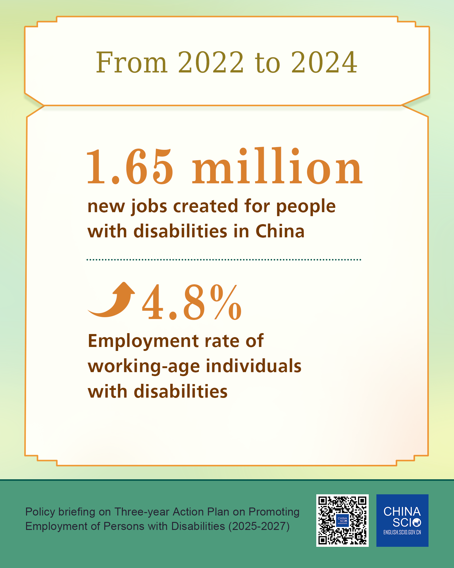 China released an action plan to promote the employment of persons with disabilities in 2022. From 2022 to 2024, a total of 1.65 million new jobs for people with disabilities were created in urban and rural areas, and the employment rate of working-age individuals with disabilities increased by 4.8%. Employability skills of persons with disabilities were further enhanced, and the employment rate of college graduates with disabilities has remained above 85% for five consecutive years, said Li Dongmei, vice chairperson of the China Disabled Persons' Federation, on Wednesday.