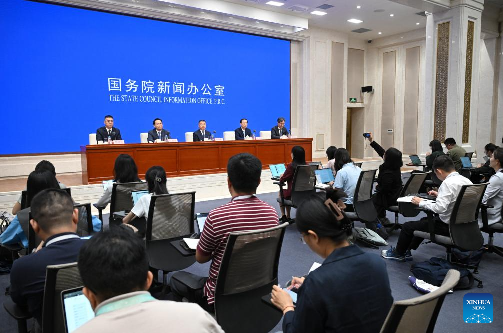 Hu Jinglin, director of the State Taxation Administration (STA), STA deputy commissioners Wang Daoshu and Cai Zili, and Rong Hailou, a spokesman for the STA, attend a press conference held by the State Council Information Office (SCIO) on tax reform and development in the 14th Five-Year Plan period (2021-2025) in Beijing, capital of China, July 28, 2025. (Xinhua/Chen Yehua)
