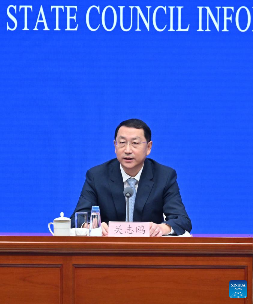 Guan Zhiou, minister of natural resources and general supervisor of national natural resources, speaks at a press conference held by the State Council Information Office (SCIO) on achievements in high-quality natural resources development during the 14th Five-Year Plan period (2021-2025) in Beijing, capital of China, Sept. 10, 2025.