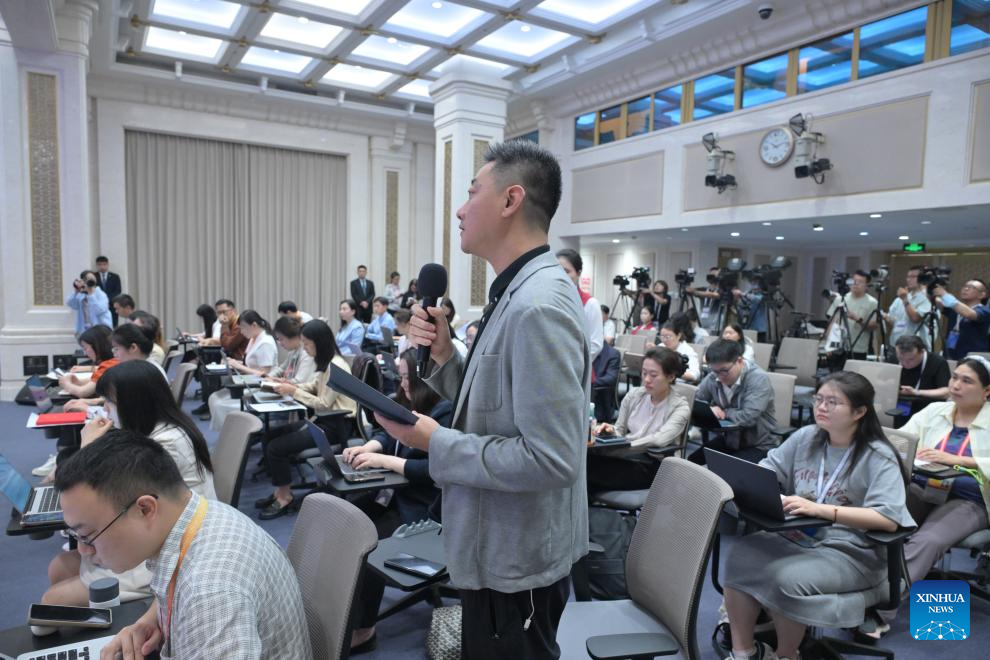 A journalist asks questions at a press conference held by the State Council Information Office (SCIO) on achievements in high-quality natural resources development during the 14th Five-Year Plan period (2021-2025) in Beijing, capital of China, Sept. 10, 2025.