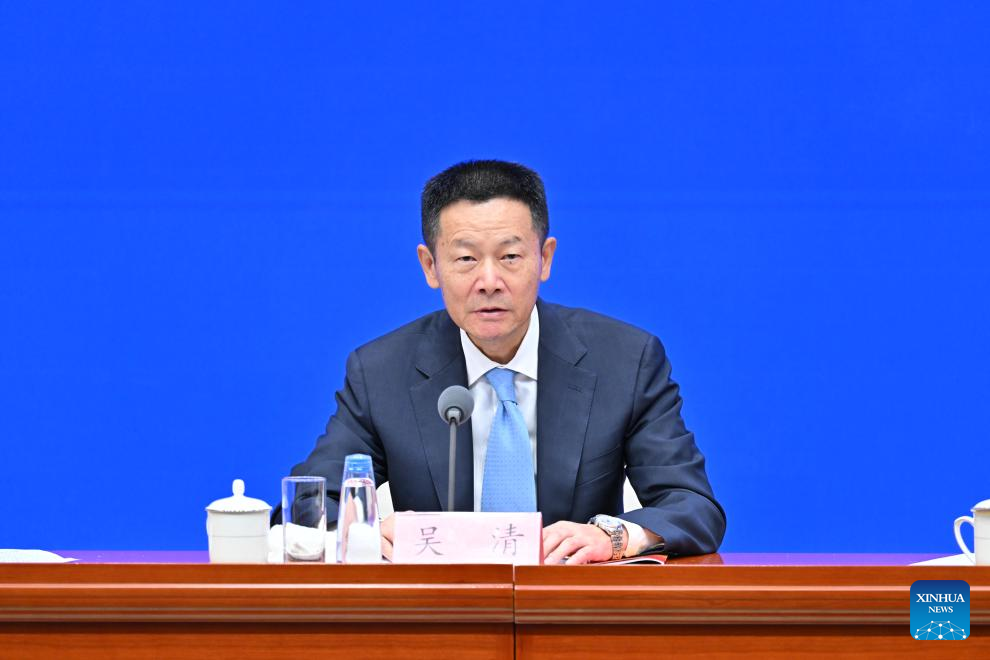 Wu Qing, chairman of the China Securities Regulatory Commission, speaks at a press conference held by the State Council Information Office (SCIO) on achievements in the financial sector during the 14th Five-Year Plan period (2021-2025) in Beijing, capital of China, Sept. 22, 2025. (Xinhua/Li Xin)