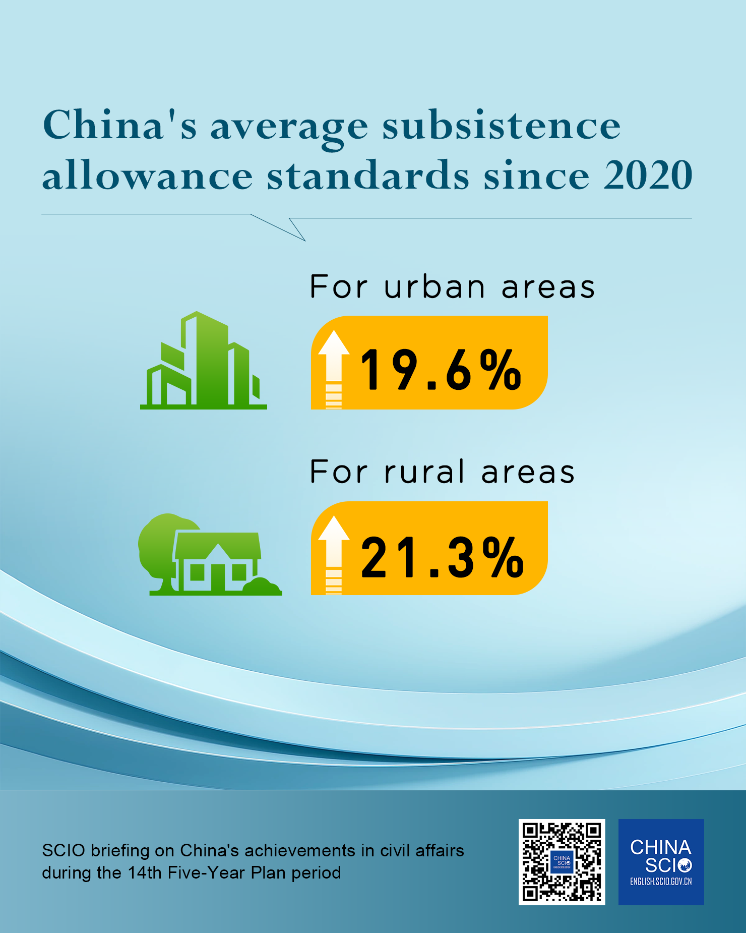 The average subsistence allowance for urban and rural residents in China has increased by 19.6% and 21.3%, respectively, compared with 2020, according to the Ministry of Civil Affairs.