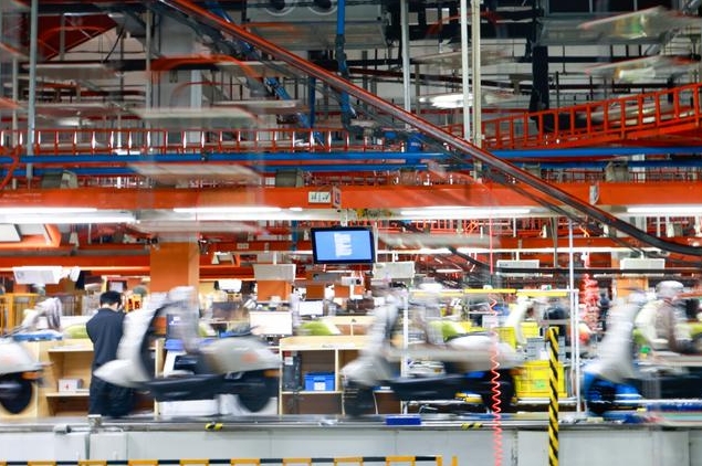 This photo shows the production line of YADEA at the electric scooter industrial park in Xishan District, Wuxi, east China's Jiangsu Province, Sept. 16, 2025. (Xinhua/Liu Jiaqi)