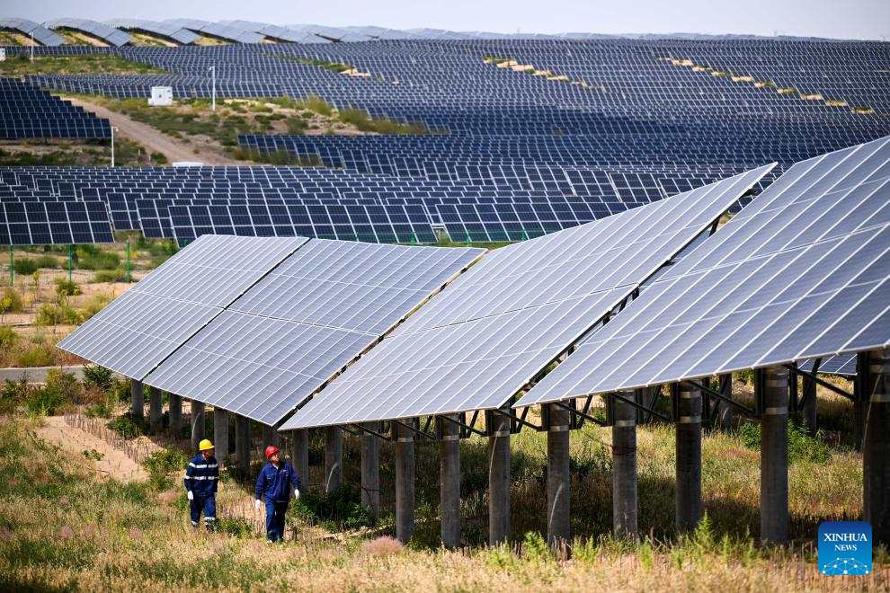 Inspectors walk along solar panels at the Dalad Banner photovoltaic base in the Kubuqi Desert, northern China's Inner Mongolia autonomous region, Sept. 10, 2025. [Photo/Xinhua]