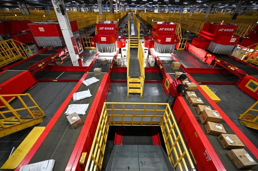 A staff member works at an automated parcel sorting line at an express hub of courier service provider J&T Express in Jiangning District of Nanjing City, east China's Jiangsu Province, Nov. 11, 2025. (Photo by Fang Dongxu/Xinhua)