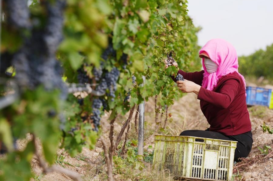 A farmer harvests wine grapes at Minning Town, Yongning County in Yinchuan, northwest China's Ningxia Hui Autonomous Region, Oct. 14, 2025. Nestled at the base of the Helan Mountains, rows of lush vineyards line the Yellow River, showcasing the transformation of Minning Town. (Xinhua/Yang Zhisen)