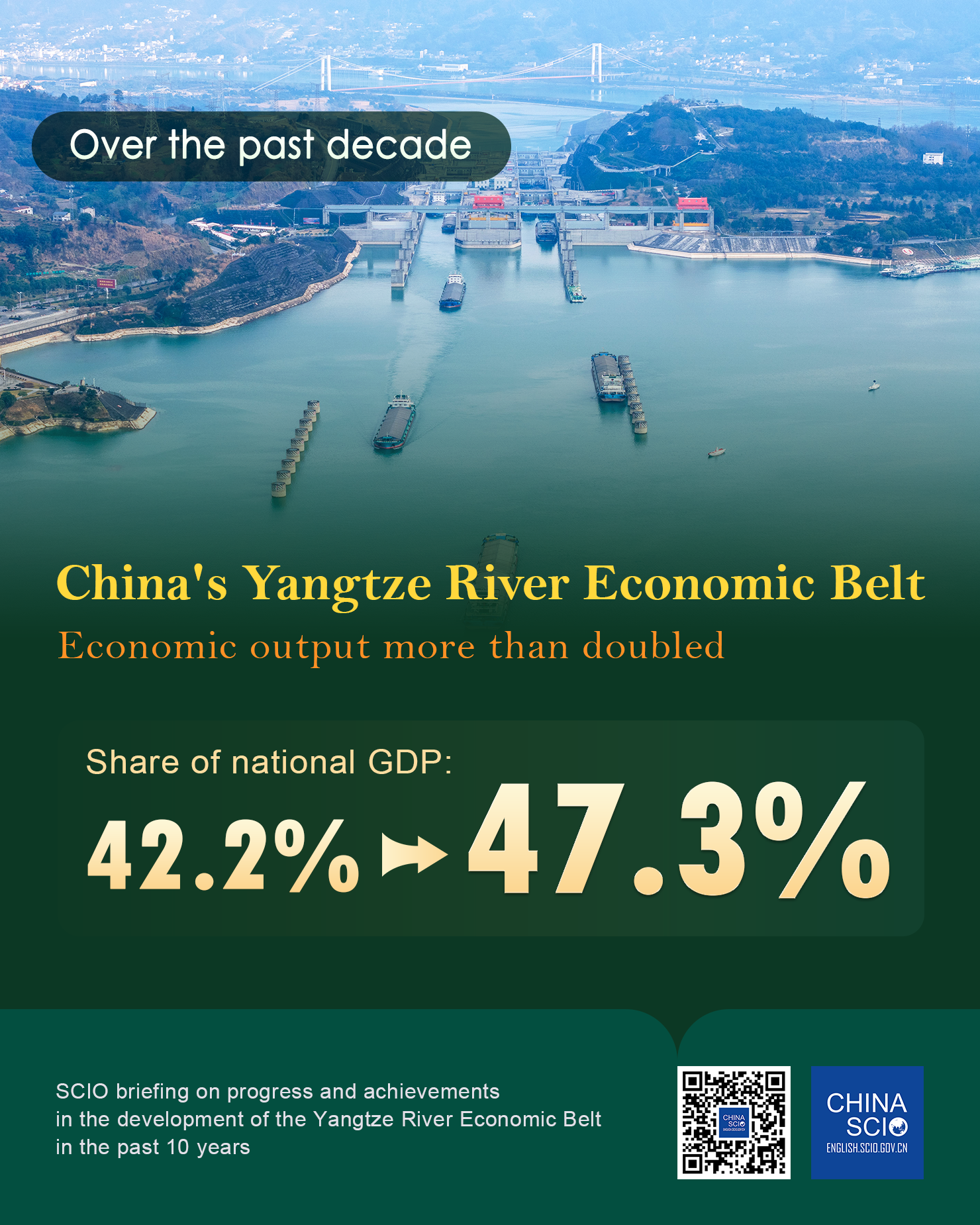 Over the past decade, the economic output of China's Yangtze River Economic Belt has more than doubled, with its share of the country's gross domestic product rising from 42.2% to 47.3%, according to a press conference on Monday.