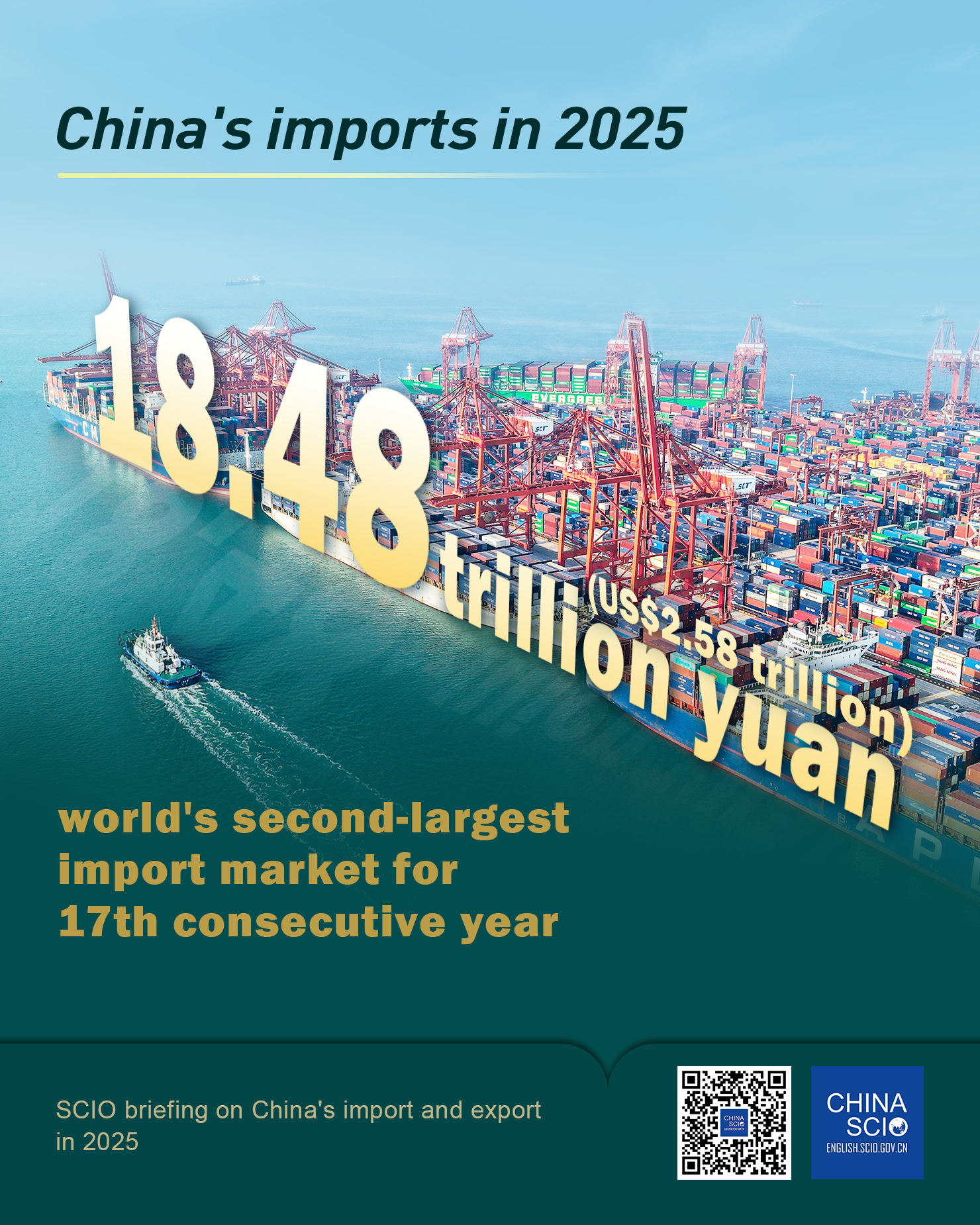China's imports hit a record high of 18.48 trillion yuan (US$2.58 trillion) in 2025, maintaining its position as the world's second-largest import market for the 17th consecutive year, said Wang Jun, vice minister of the General Administration of Customs of China, on Wednesday. He said China will open up further to the world, and its vast market will continue to offer enormous opportunities globally.