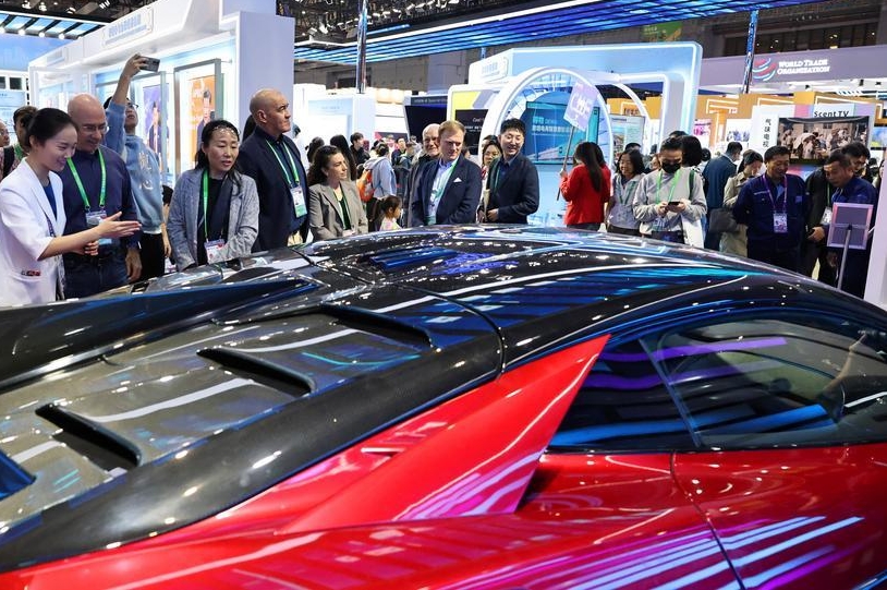 Guests view a new energy vehicle (NEV) of BYD, China's leading NEV manufacturer, at the China Pavilion during the eighth China International Import Expo (CIIE) in east China's Shanghai, Nov. 8, 2025. (Xinhua/Fang Zhe)