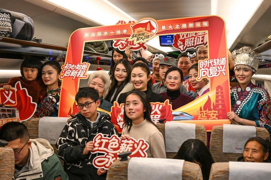 Railway staff members and passengers pose for a group photo on the high-speed train G3360 in southwest China's Guizhou Province, Jan. 26, 2026. (Xinhua/Yang Wenbin)