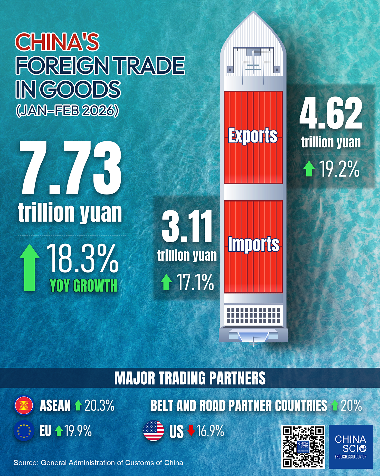 China's foreign trade grew 18.3% year on year to 7.73 trillion yuan (US$1.12 trillion) in the first two months of 2026, with exports rising 19.2% and imports up 17.1%, according to data released Tuesday by the General Administration of Customs.