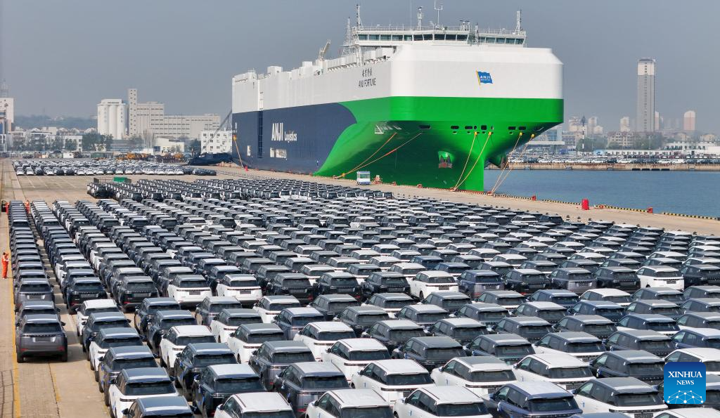A drone photo taken on April 14, 2026 shows vehicles to be exported at Yantai Port in easten China's Shandong province. [Photo/Xinhua]