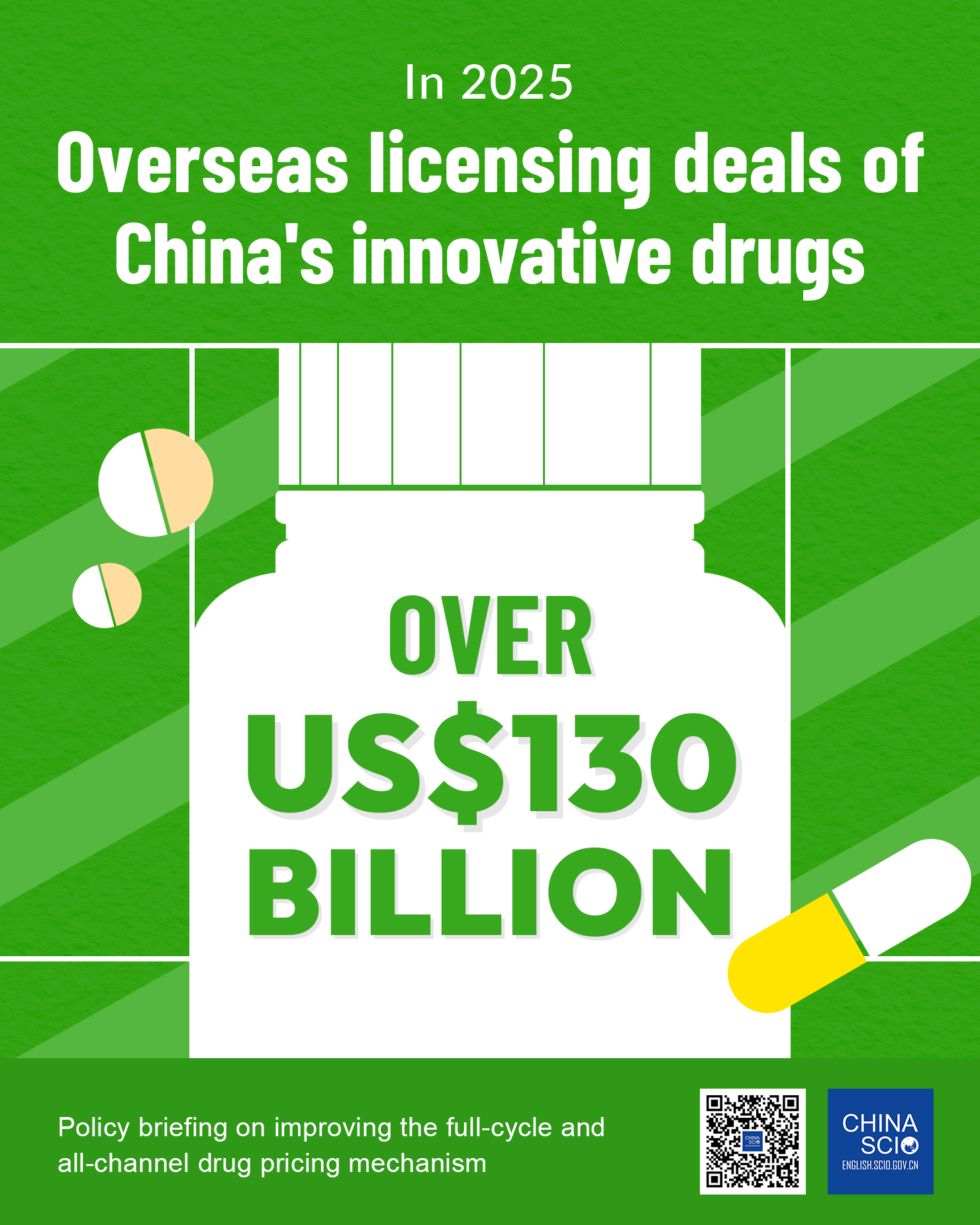 China is surging in global pharma innovation. One-third of the world's innovative drugs in development come from China, including star anti-cancer treatments like Zanubrutinib and Ivonescimab. In 2025, overseas licensing deals for Chinese innovative drugs soared past US$130 billion, a historic high for the sector, according to a Wednesday briefing.