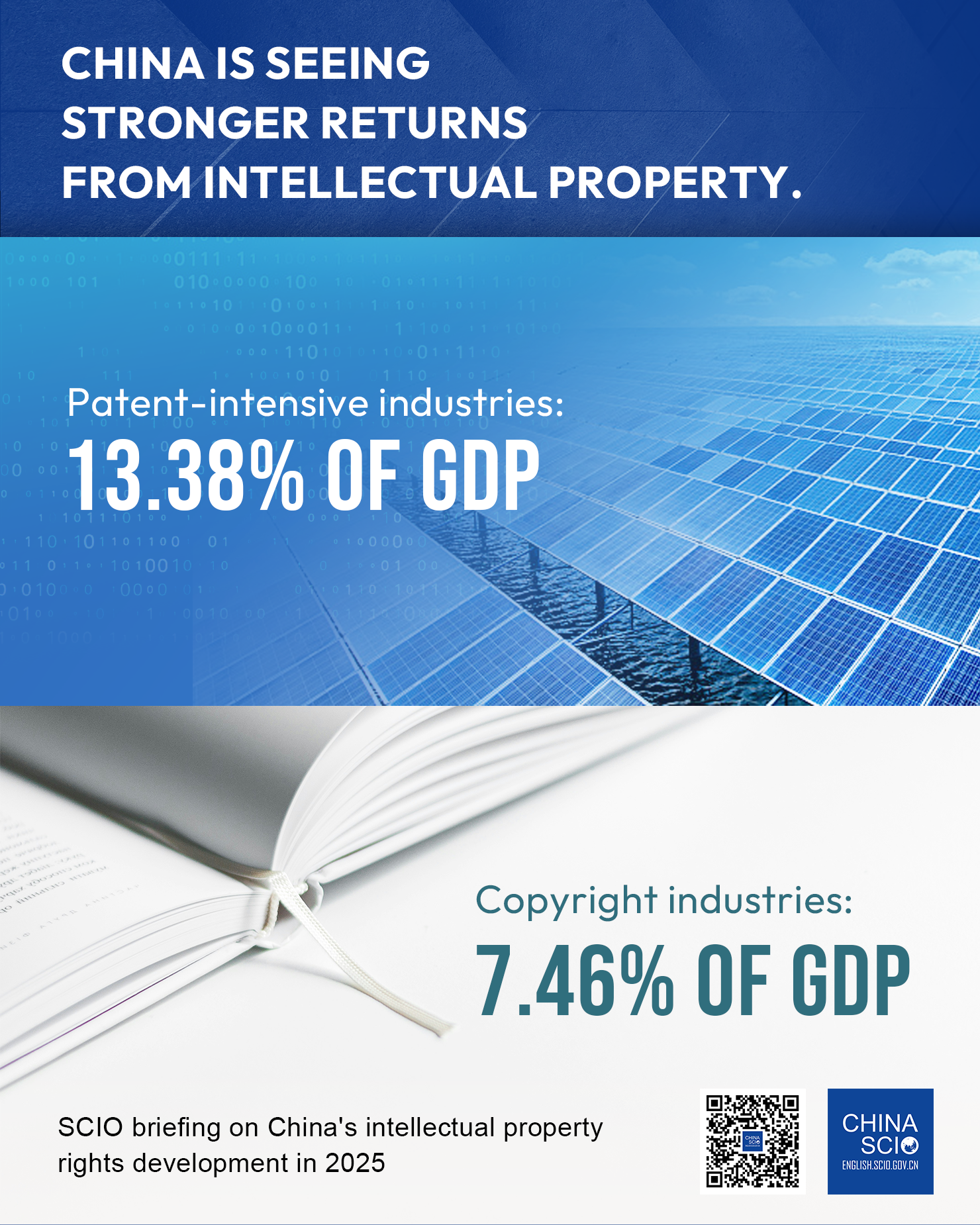 China is seeing stronger returns from intellectual property, with patent-intensive and copyright industries accounting for 13.38% and 7.46% of the country's GDP, respectively, the China National Intellectual Property Administration said Thursday.