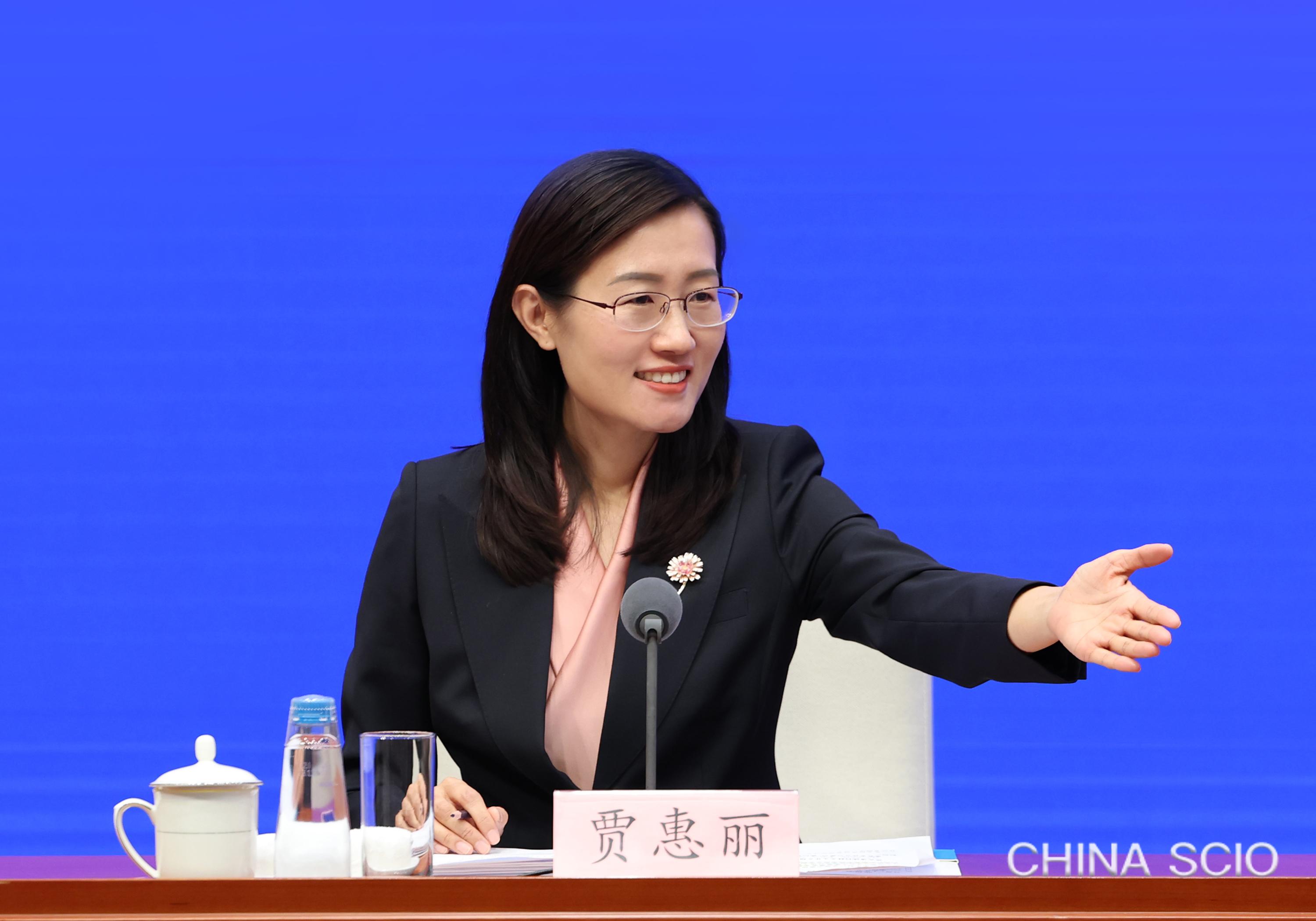Jia Huili, deputy director general of the Press Bureau of the State Council Information Office (SCIO) and spokesperson of the SCIO, invites journalists to raise questions at a policy briefing in Beijing, April 28, 2026. [Photo by Luan Haijun/China SCIO]