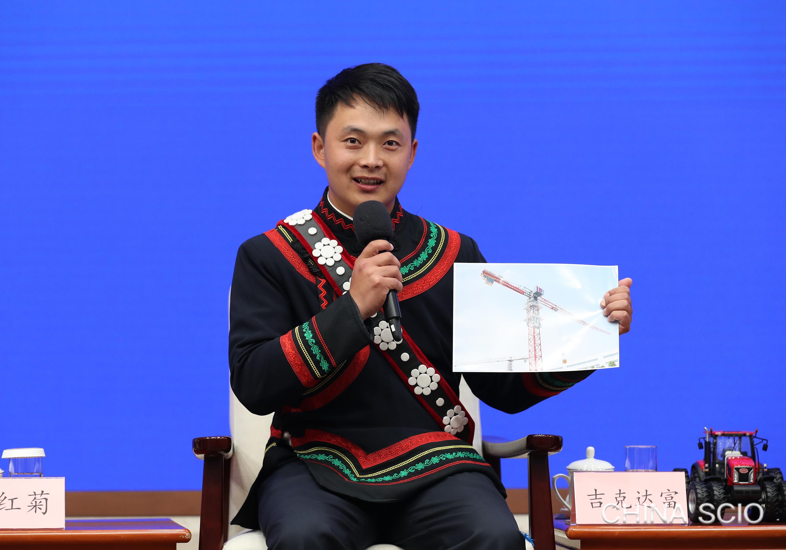 Jik Dafu, team leader at the Tower Crane Branch of Shanxi First Construction Group Co. Ltd., attends a group interview in Beijing, April 29, 2026. [Photo by Xu Xiang/China SCIO]