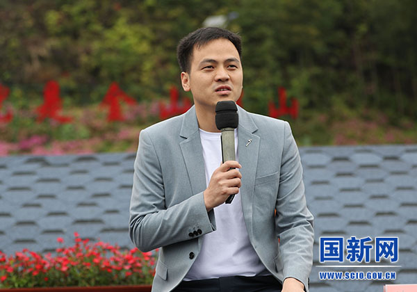 Xie Yanjun, general manager of the Gutian Study Tour Base in Jinggangshan, speaks at a group interview in Mayuan village, Maoping town of Jinggangshan, eastern China's Jiangxi province, on April 10, 2021. [Photo by Xu Xiang/China SCIO]