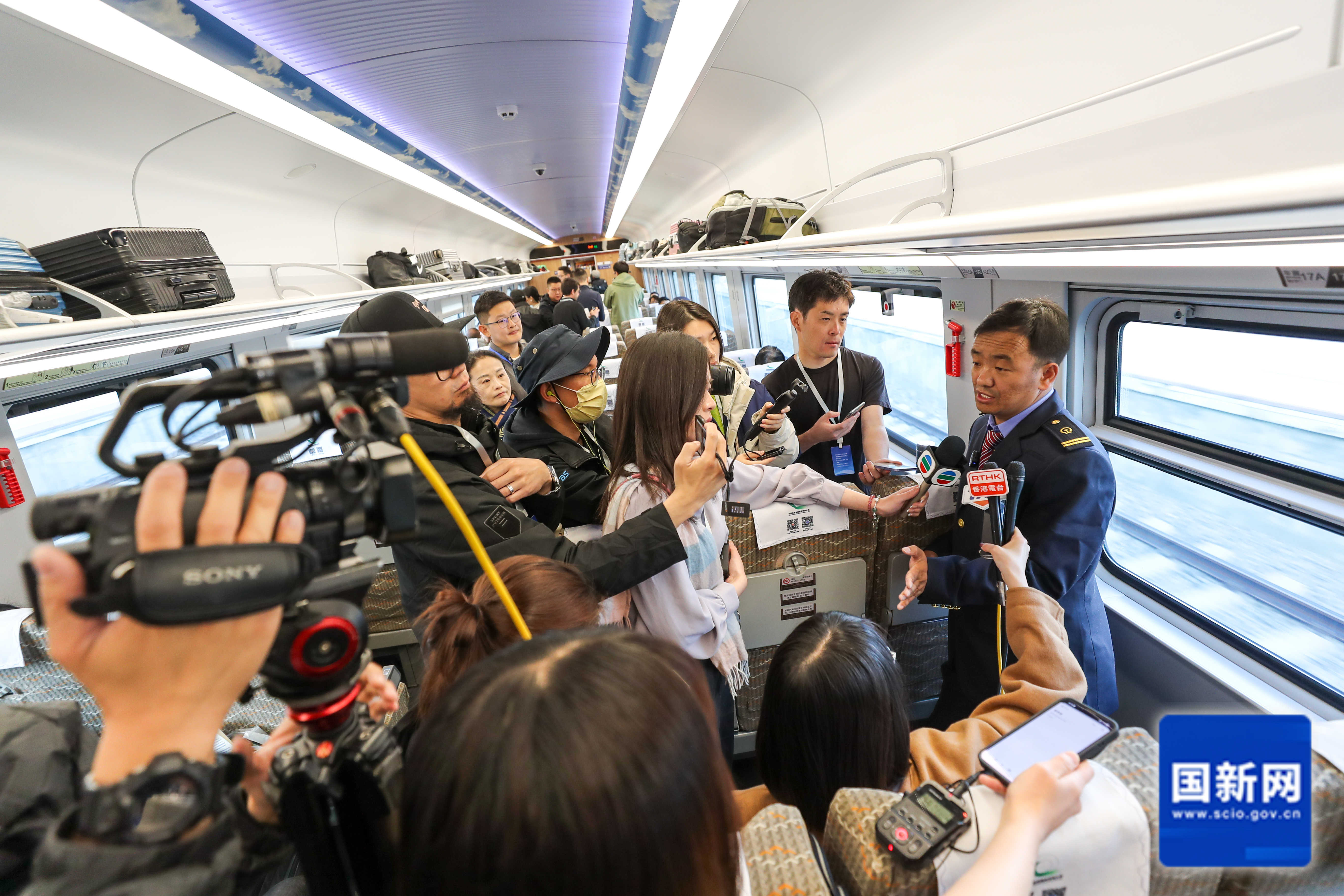 A person in charge of the Lhasa Station of China Railway Qinghai-Xizang Group Co. Ltd. speaks with journalists on the high-speed C881 train, March 30, 2025. [Photo by Xu Xiang/China SCIO]