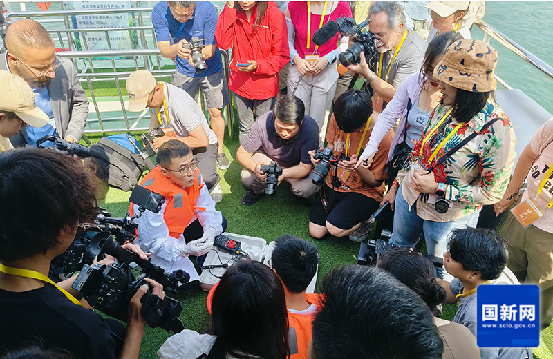 Reporters take a boat ride to watch the debris-clearing operations and water quality monitoring process on the Yangtze River in Chongqing, May 21, 2025. [Photo by Liu Jian/China SCIO]