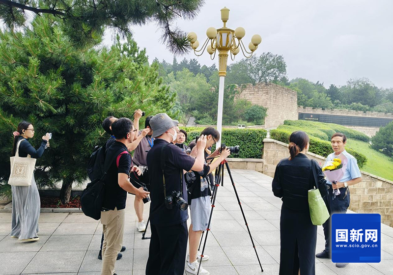 Reporters interview a visitor at the Hundred Regiments Campaign Memorial Hall and Monument in Yangquan, Shanxi province, July 24, 2025. [Photo by Liu Jian/China SCIO]