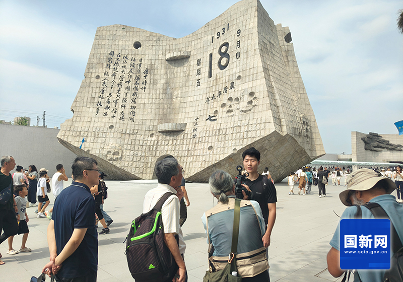 Reporters interview a visitor at the 9.18 Historical Museum in Shenyang, Liaoning province, Aug. 12, 2025. [Photo by Luan Haijun/China SCIO]