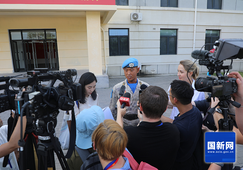Journalists interview a soldier of the foot formations at a V-Day military parade training site, Aug. 20, 2025. [Photo by Liu Jian/China SCIO]