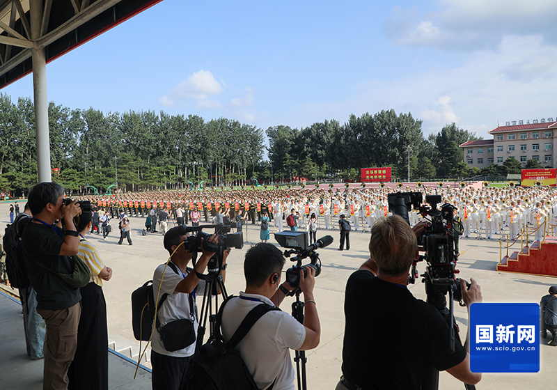 Journalists capture footage of the joint military band's rehearsal for the V-Day military parade at a training site, Aug. 20, 2025. [Photo by Liu Jian/China SCIO]
