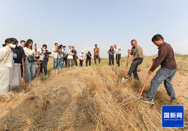 Reporters try their hands at an anti-desertification method called "straw checkerboard" at Baijitan National Nature Reserve in Lingwu, Ningxia Hui autonomous region, Sept. 15, 2025. [Photo by Xu Xiang/China SCIO]