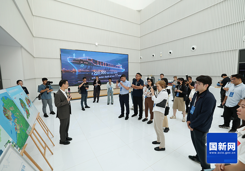 Reporters visit the exhibition hall of the Yangpu Economic Development Zone in Danzhou, Hainan province. [Photo by Liu Jian/China SCIO]