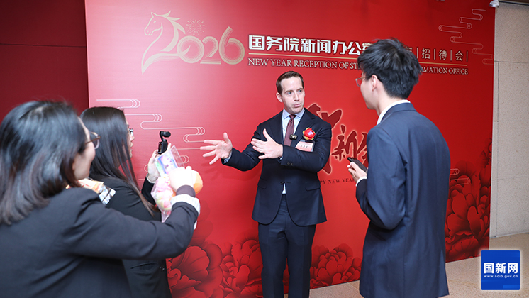 A guest gives an interview at a New Year reception held by the State Council Information Office at the National Museum of China in Beijing, Dec. 16, 2025. [Photo/China SCIO]