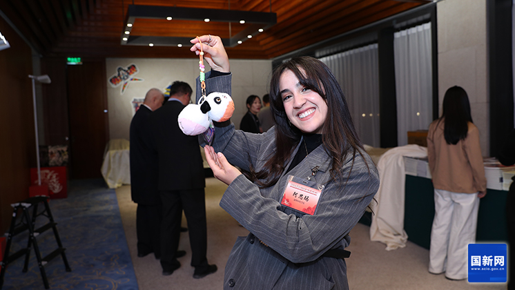 A guest showcases a panda gift at a New Year reception held by the State Council Information Office at the National Museum of China in Beijing, Dec. 16, 2025. [Photo/China SCIO]