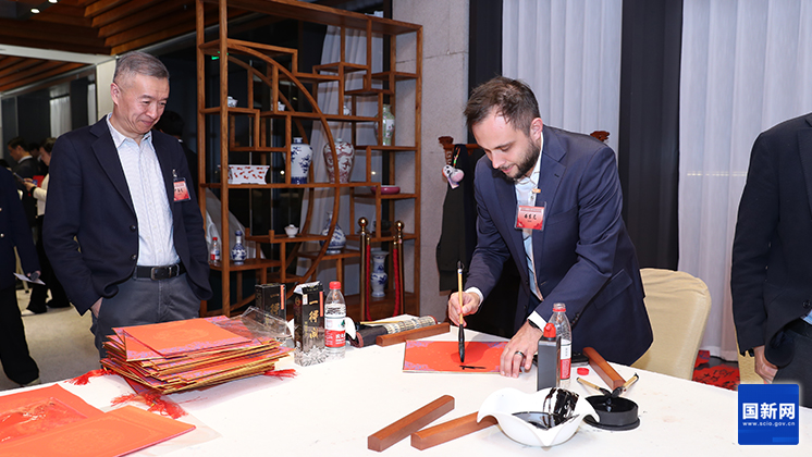 A guest performs Chinese calligraphy at a New Year reception held by the State Council Information Office at the National Museum of China in Beijing, Dec. 16, 2025. [Photo/China SCIO]