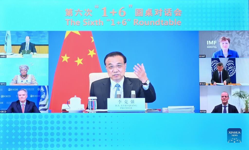 Chinese Premier Li Keqiang holds the sixth "1+6" Roundtable in Beijing via video link with heads of major international economic organizations, Dec. 6, 2021. President of the World Bank Group David Malpass, Managing Director of the International Monetary Fund Kristalina Georgieva, Director-General of the World Trade Organization Ngozi Okonjo-Iweala, Director-General of the International Labor Organization Guy Ryder, Secretary-General of the Organization for Economic Cooperation and Development Mathias Cormann, and Chairman of the Financial Stability Board Klaas Knot attended the meeting. (Xinhua/Li Xiang)