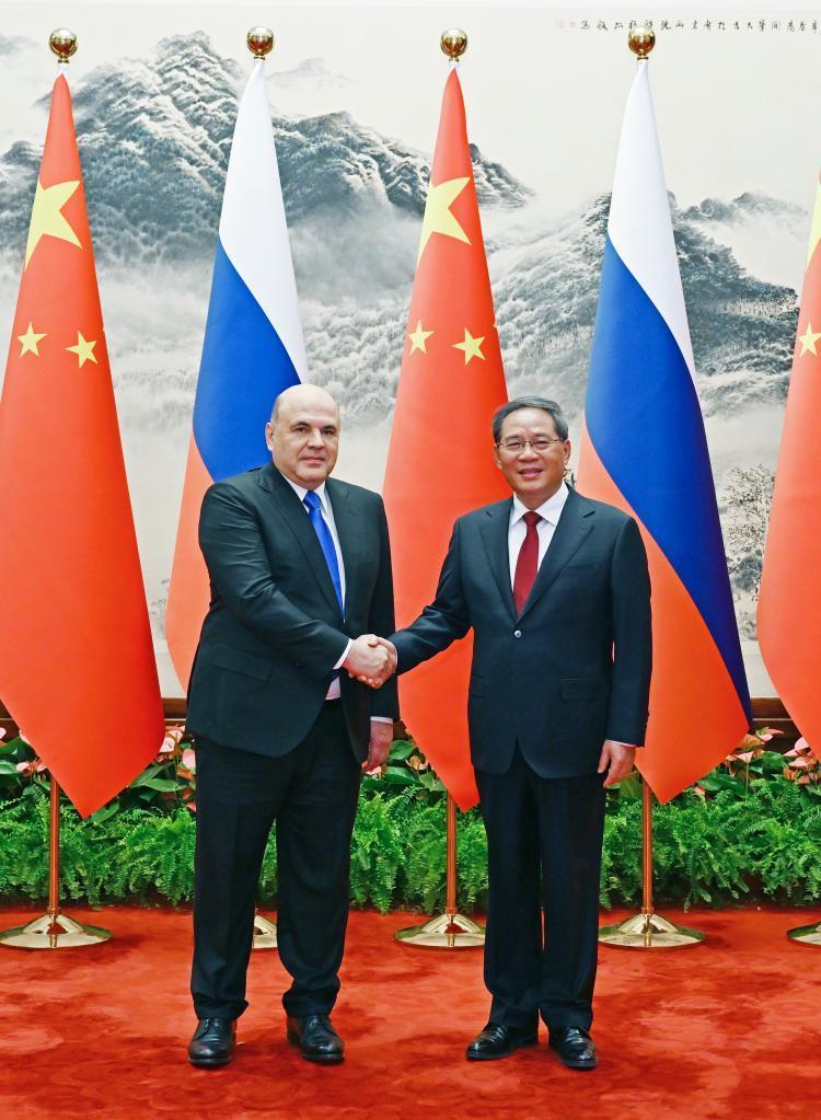 Chinese Premier Li Qiang holds talks with Prime Minister of the Russian Federation Mikhail Mishustin in Beijing, capital of China, May 24, 2023. (Xinhua/Zhang Ling)