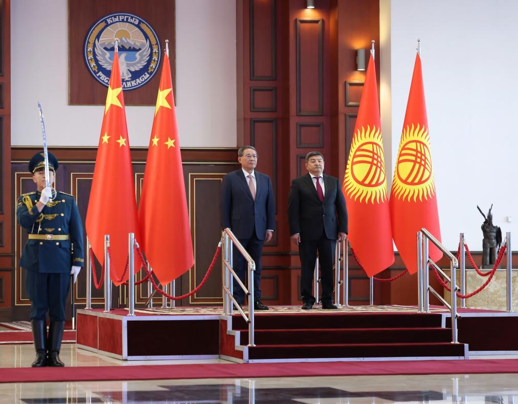 Chinese Premier Li Qiang attends a grand welcome ceremony held by Kyrgyz Prime Minister Akylbek Japarov at Manas International Airport in Bishkek, Kyrgyzstan, Oct. 24, 2023. Li Qiang arrived on Tuesday to attend the 22nd Meeting of the Council of Heads of Government of the Shanghai Cooperation Organization (SCO) Member States, and pay an official visit to the Kyrgyz Republic from Tuesday to Friday at the invitation of Kyrgyz Prime Minister Akylbek Japarov. (Xinhua/Wang Ye)