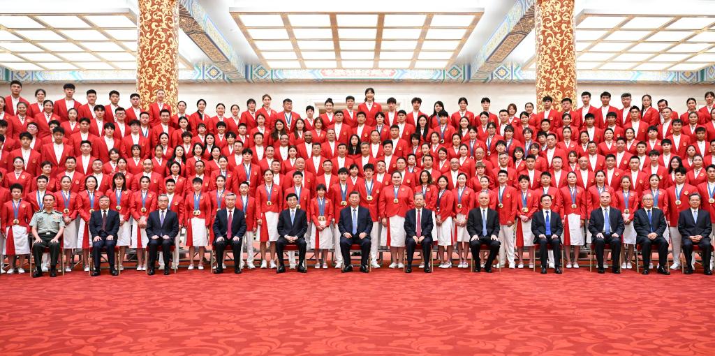 Party and state leaders Xi Jinping, Zhao Leji, Wang Huning, Cai Qi, Li Xi and Han Zheng meet with China's Olympic delegation for Paris 2024 at the Great Hall of the People in Beijing, capital of China, Aug. 20, 2024. (Xinhua/Xie Huanchi)