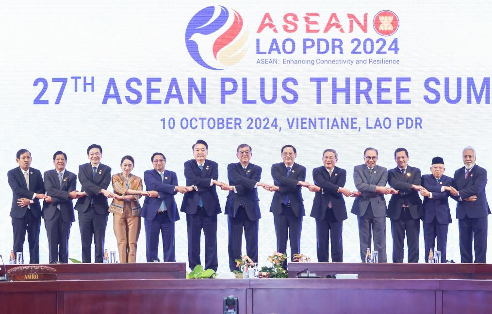Chinese Premier Li Qiang poses for a group photo before the 27th ASEAN Plus Three (APT) Summit in Vientiane, Laos, Oct. 10, 2024. Li attended the 27th ASEAN Plus Three (APT) Summit here on Thursday. (Xinhua/Liu Bin)