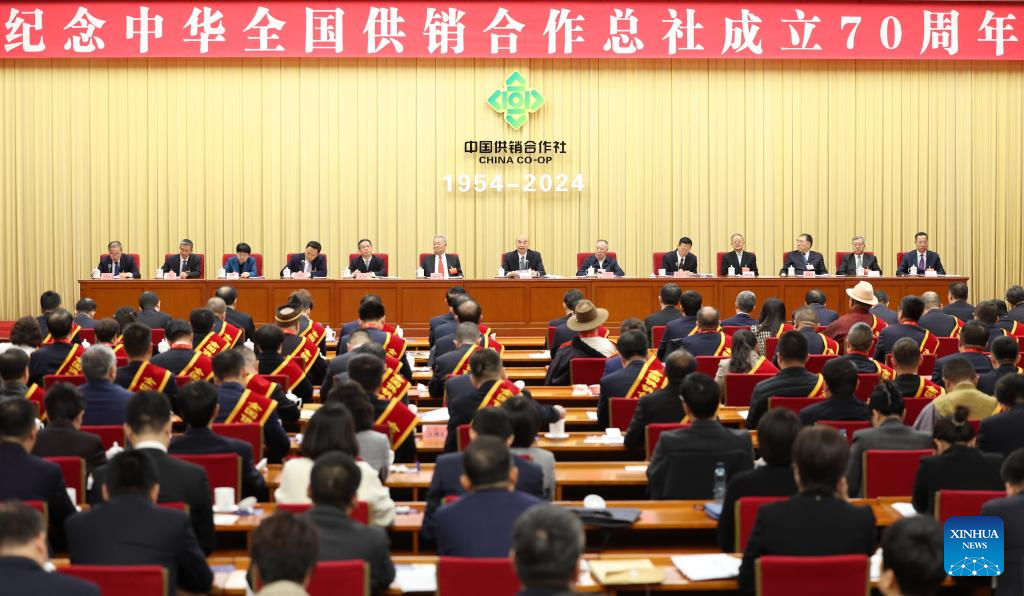 A meeting is held to mark the 70th founding anniversary of the All China Federation of Supply and Marketing Cooperatives in Beijing, capital of China, Nov. 28, 2024. The meeting conveyed an instruction by Chinese President Xi Jinping, also general secretary of the Communist Party of China (CPC) Central Committee and chairman of the Central Military Commission. Chinese Premier Li Qiang, also a member of the Standing Committee of the Political Bureau of the CPC Central Committee, gave an instruction regarding supply and marketing cooperatives. Chinese Vice Premier Liu Guozhong, also a member of the Political Bureau of the CPC Central Committee, attended the meeting and delivered a speech. (Xinhua/Ding Haitao)
