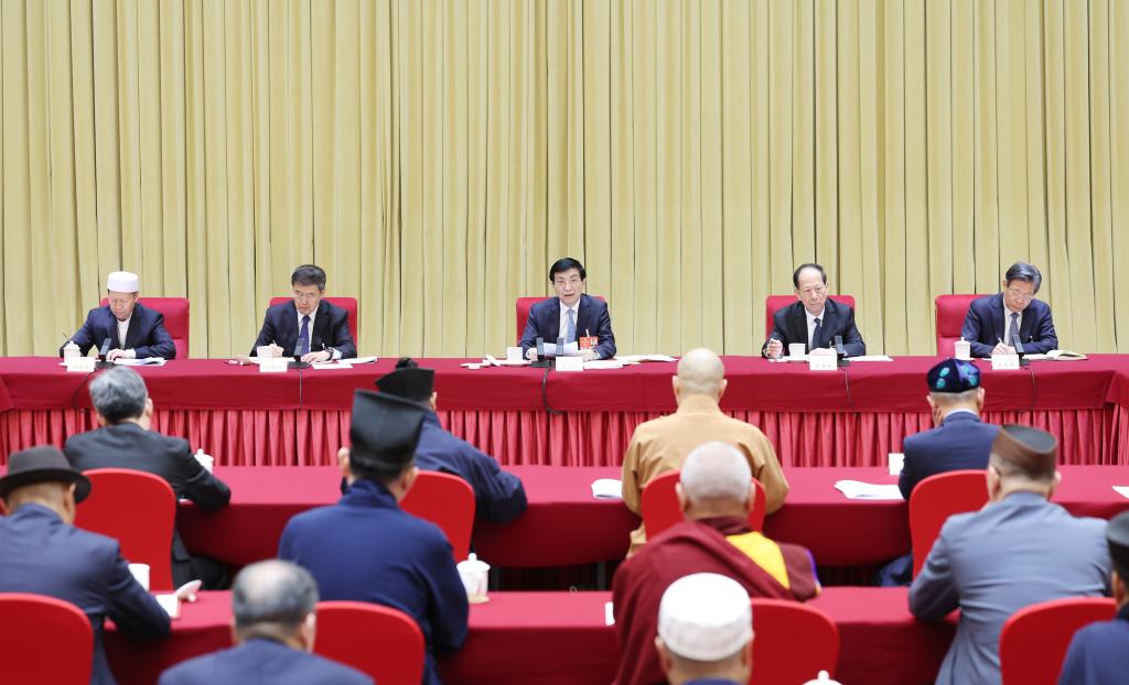 Wang Huning, a member of the Standing Committee of the Political Bureau of the Communist Party of China Central Committee and chairman of the National Committee of the Chinese People's Political Consultative Conference (CPPCC), attends a discussion with political advisors from the sector of religious bodies at the third session of the 14th CPPCC National Committee in Beijing, capital of China, March 6, 2025. (Xinhua/Yao Dawei)