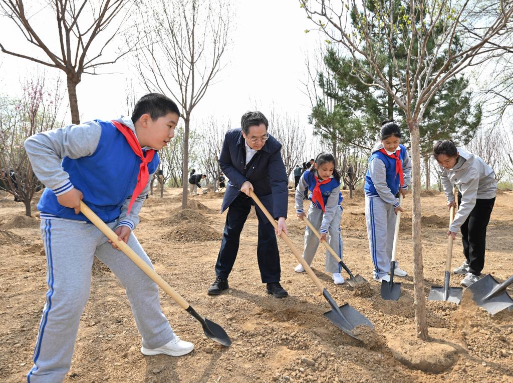 Ding Xuexiang plants a tree during a voluntary tree planting activity in Fengtai District of Beijing, capital of China, April 3, 2025. Party and state leaders Xi Jinping, Li Qiang, Zhao Leji, Wang Huning, Cai Qi, Ding Xuexiang, Li Xi, and Han Zheng, arrived at the tree planting site on the bank of a river in Fengtai District on Thursday morning and planted trees with officials and local people. (Xinhua/Yin Bogu)
