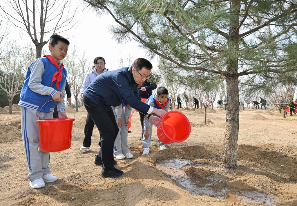 Han Zheng plants a tree during a voluntary tree planting activity in Fengtai District of Beijing, capital of China, April 3, 2025. Party and state leaders Xi Jinping, Li Qiang, Zhao Leji, Wang Huning, Cai Qi, Ding Xuexiang, Li Xi, and Han Zheng, arrived at the tree planting site on the bank of a river in Fengtai District on Thursday morning and planted trees with officials and local people. (Xinhua/Yin Bogu)