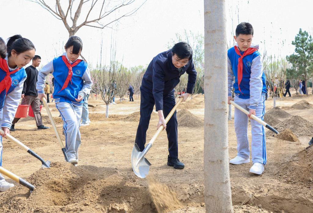 Wang Huning plants a tree during a voluntary tree planting activity in Fengtai District of Beijing, capital of China, April 3, 2025. Party and state leaders Xi Jinping, Li Qiang, Zhao Leji, Wang Huning, Cai Qi, Ding Xuexiang, Li Xi, and Han Zheng, arrived at the tree planting site on the bank of a river in Fengtai District on Thursday morning and planted trees with officials and local people. (Xinhua/Liu Bin)