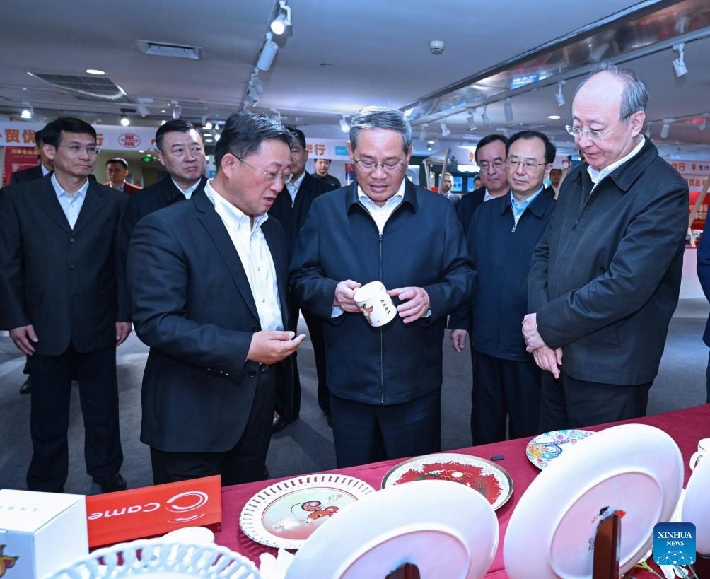 Chinese Premier Li Qiang, also a member of the Standing Committee of the Political Bureau of the Communist Party of China Central Committee, inspects a local exhibition promoting domestic sales of foreign trade firms in Beijing, capital of China, April 15, 2025. Li made an investigation and research tour in Beijing on Tuesday. (Xinhua/Rao Aimin)